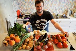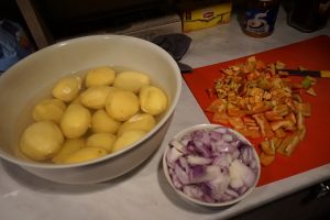 Die Eier mit Muskat und einer Prise Salz in einer Schüssel verquirlen. Nach und nach Mehl dazu geben so das ein Teig entsteht. Wenn die Masse fester wird mit einem Holzlöffel Luft unterheben/-schlagen. Ein bis zwei Esslöffel Quark dazugeben und vermischen. Ist die Masse zu fest einen Schuss Sprudel dazugeben; zu weich mehr Mehl. Wenn der Teig durch das Schlagen Luftblasen bildet ist er fertig. Während er ruht, Kartoffeln und Gemüse waschen. Kartoffeln schälen und in gleichgroße Stücke schneiden, z.B. in 1/8. Diese dann in einem Topf mit Salzwasser geben und auf den Herd Stellen. Das Gemüse in etwa gleichgroße Stücke wie die Kartoffel schneiden und in einer Pfanne mit etwas Olivenöl scharf anbraten. Die Kartoffeln sollten leicht köcheln. Sobald diese fast fertig sind (je nach Größe ca. 10 -15 min Kochzeit) mit einem Esslöffel den Teig ins Wasser dazu geben sodass kleine Knödel entstehen und diese sich mit den Kartoffeln verheiraten können. (Nicht mit herkömmlichen Knödel zu vergleichen, jeder hat seine individuelle Form) Diese sind fertig sobald sie oben schwimmen. Wenn die Knödel oben schwimmen und die Kartoffel gar sind kann alles abgesiebt werden. Zum Schluss die Pfirsiche mit etwas Zucker und Butter in einer Pfanne anbräunen. Die Chili und Kräuter klein schneiden. Beim Anrichten zuerst die Geheirateten in die Mitte geben, das Gemüse darauf und als Letztes die Pfirsichen. Mit Kräutern, Chili und Olivenöl garnieren.