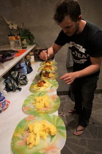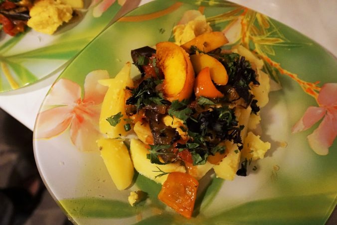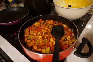 Als Soße eignet sich Tomatensoße oder auch Bolognese. Bei uns war keine Soße Notwendig da das Gemüse und die Pfirsiche saftig genug waren.